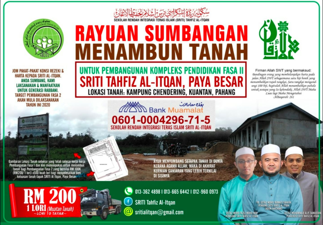 SRITI Tahfiz Al Itqan ini 100% bergantung pada sumbangan orang ramai. Sekiranya sumbangan kurang atau terputus maka proses pembinaan boleh tergendala.